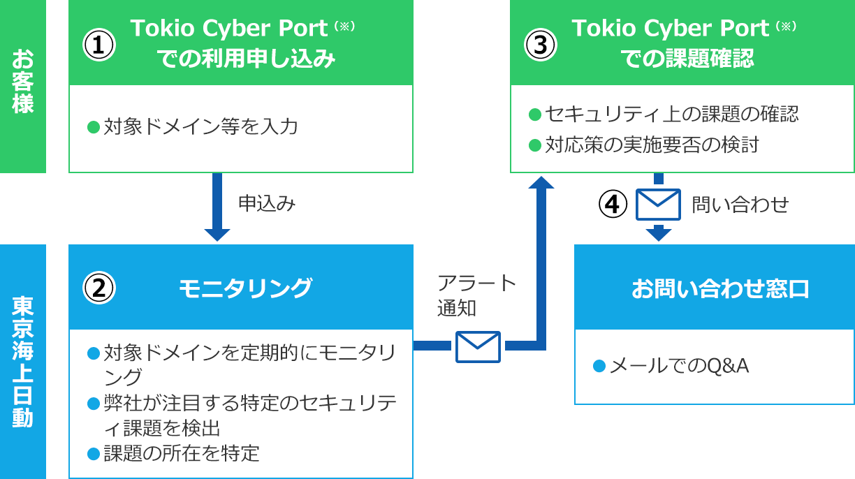 - ※本サービスのご利用にあたっては、Tokio Cyber Port上で会員登録のうえ、お申込みが必要です。アラート通知はご登録いただいたメールアドレス宛にお送りし、発見されたセキュリティ上の課題については、Tokio Cyber Port上に掲載します。